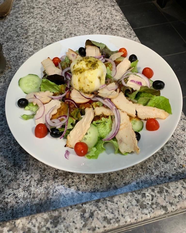 Mozza Fior di latte- Burrata-jambon cru ou saumon- oignon rouge-tomate-tomate cerise-roquette et copeaux de parmesan